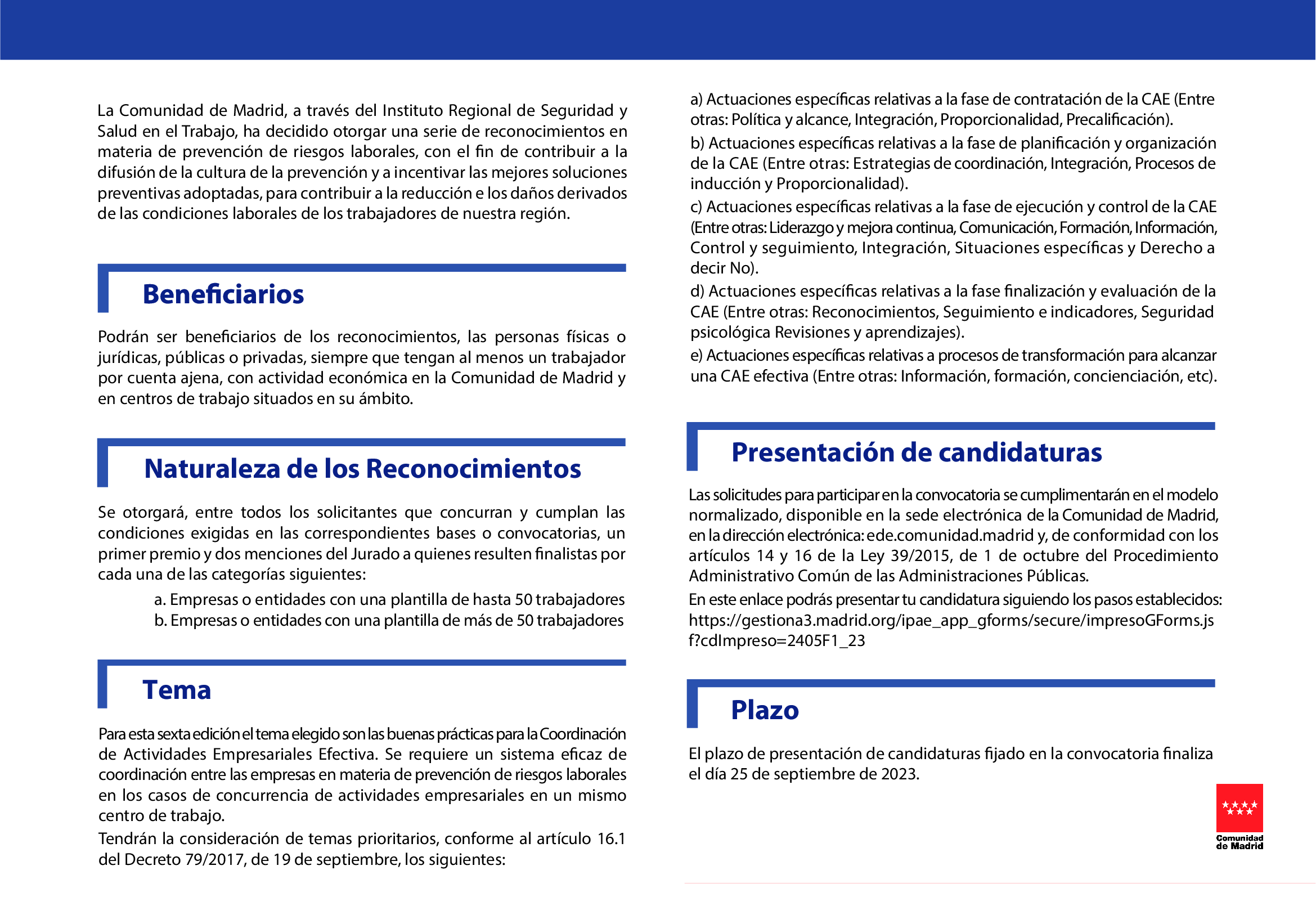 Para esta sexta edición, según recoge el recién publicado Boletín Oficial de la Comunidad de Madrid del 23 de mayo, el tema elegido son las buenas prácticas para la Coordinación de Actividades Empresariales Efectiva, o CAE Efectiva, un proyecto del IRSST y BeOn* que este año aborda su tercera fase.