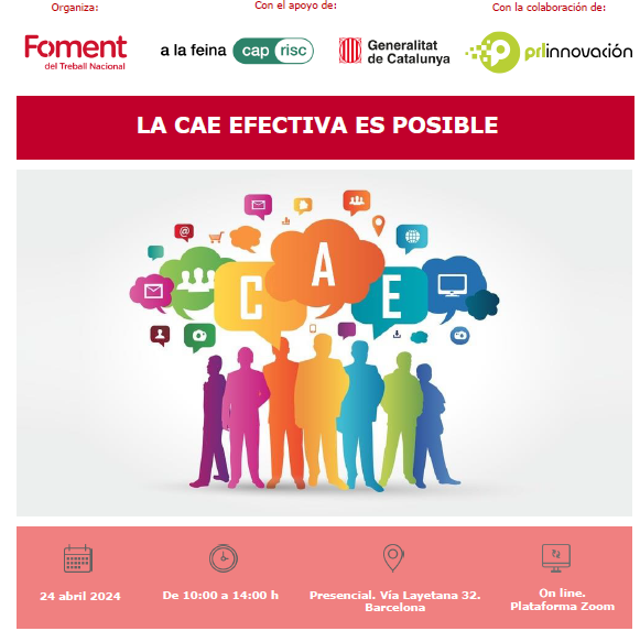 La CAE efectiva es posible. Con el objetivo de contribuir a promover un modelo de aplicación efectivo de la gestión de la Coordinación de Actividades Empresariales (CAE), Foment del Treball organiza una jornada con la colaboración de BeOn* y la participación del INSST y el IRSST para mostrar cómo lograr ser más eficaces garantizando la seguridad y la salud laboral y en el uso de los recursos disponibles, cumpliendo con la normativa vigente y protegiendo la salud de los trabajadores.