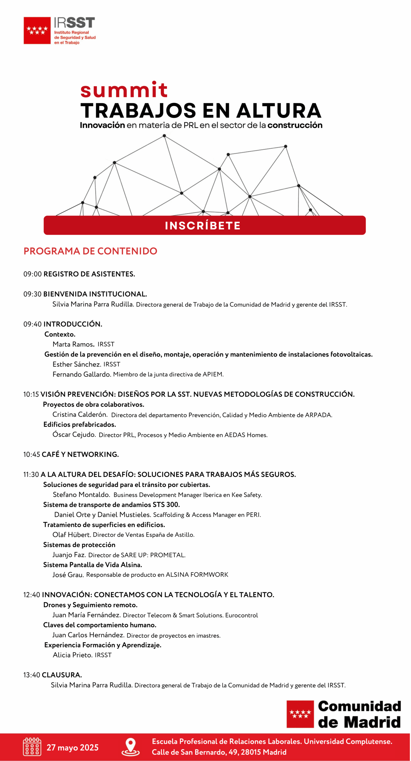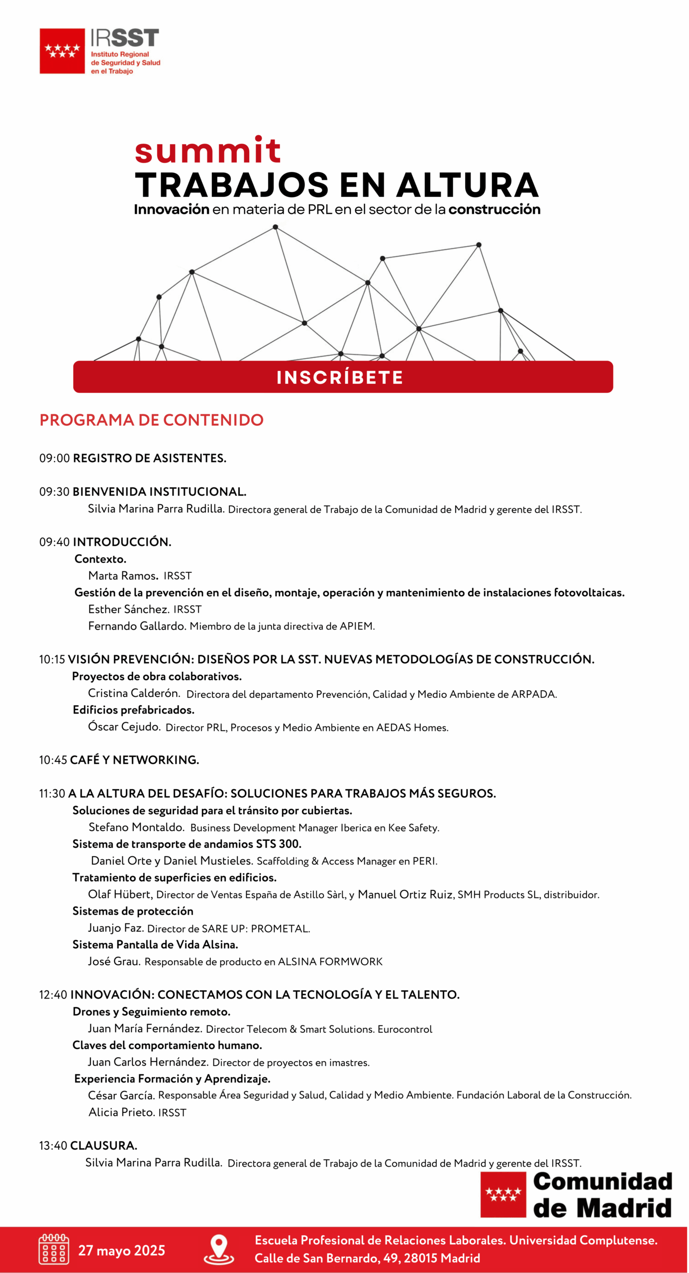 El próximo 27 de mayo el IRSST de la Comunidad de Madrid celebrará el evento “Summit Trabajos en Altura” sobre innovación en materia de PRL en el sector de la construcción, que tendrá lugar en la Escuela Profesional de Relaciones Laborales (Universidad Complutense de Madrid).