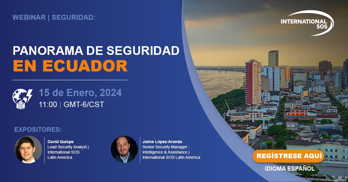 Nuestro partner International SOS organiza un webinar en el que sus expertos ofrecerán un análisis detallado de la situación actual de los eventos recientes, las implicaciones del conflicto interno en términos de seguridad y operaciones en el terreno, los efectos de la crisis para Ecuador en este año 2024, y proporcionarán recomendaciones para las organizaciones y su personal.