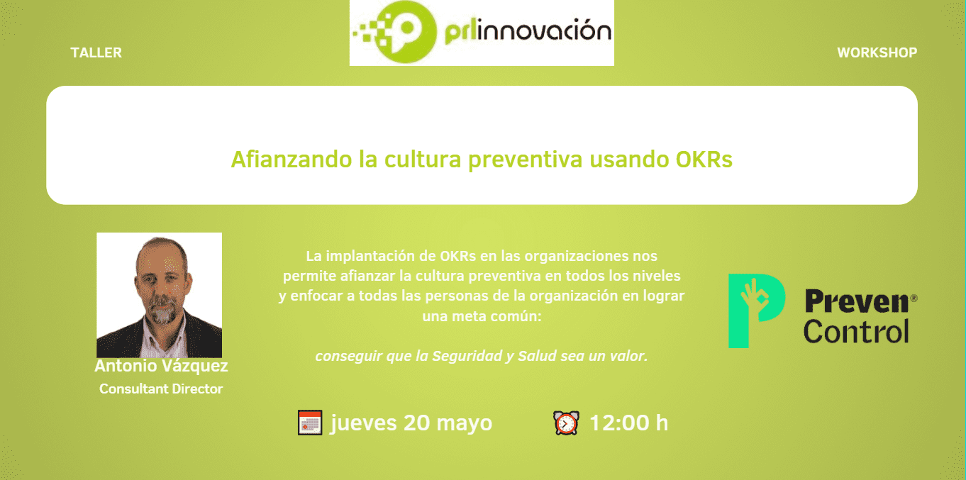 El jueves 20 de mayo, Antonio Vázquez, Consultant Director de PrevenControl, lidera un taller práctico de 2 horas para enseñarnos cómo utilizar los OKRs.