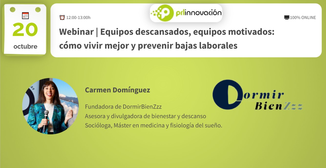 Con esta premisa, el viernes 20 de octubre Carmen Domínguez, socióloga, Máster en medicina y fisiología del sueño, y Fundadora de DomirBienZzzz, nos hablará sobre cómo entender la importancia del Sueño y el Descanso tanto para el buen desempeño en la empresa como para la vida diaria.