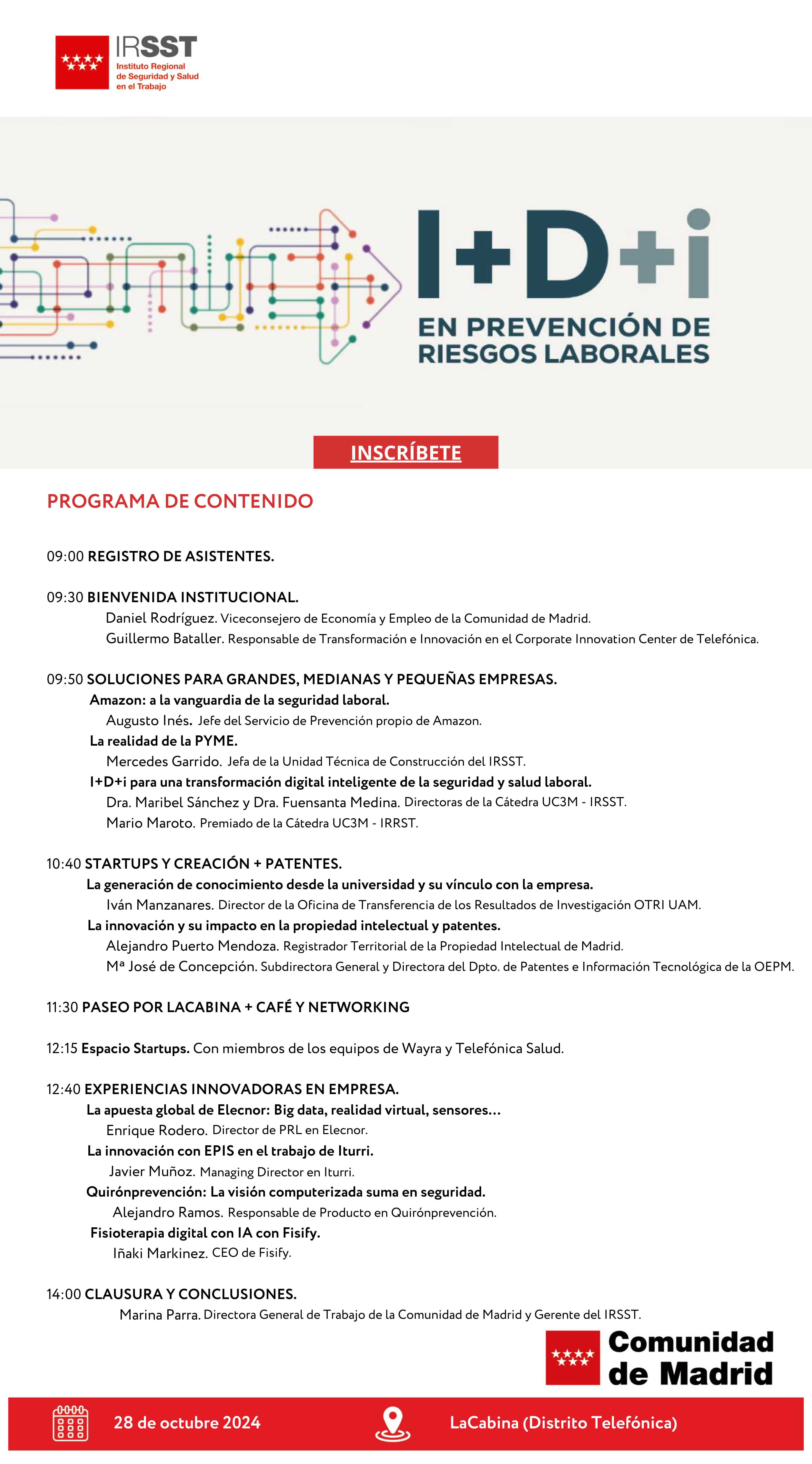 Madrid, 4 de octubre de 2024 – El Instituto Regional de Seguridad y Salud en el Trabajo (IRSST) de la Comunidad de Madrid celebrará el próximo día 28 de octubre el evento “I+D+i en Prevención de Riesgos Laborales” en el icónico espacio LaCabina del Distrito Telefónica, ubicado en Ronda de la Comunicación, Fuencarral-El Pardo (Madrid). El objetivo es convertirse en una plataforma única para abordar cuestiones clave relacionadas con la tecnología y la innovación en el campo de la prevención de riesgos laborales, y el programa del mismo es un reflejo del compromiso institucional, empresarial y social con la visión global del ámbito laboral.