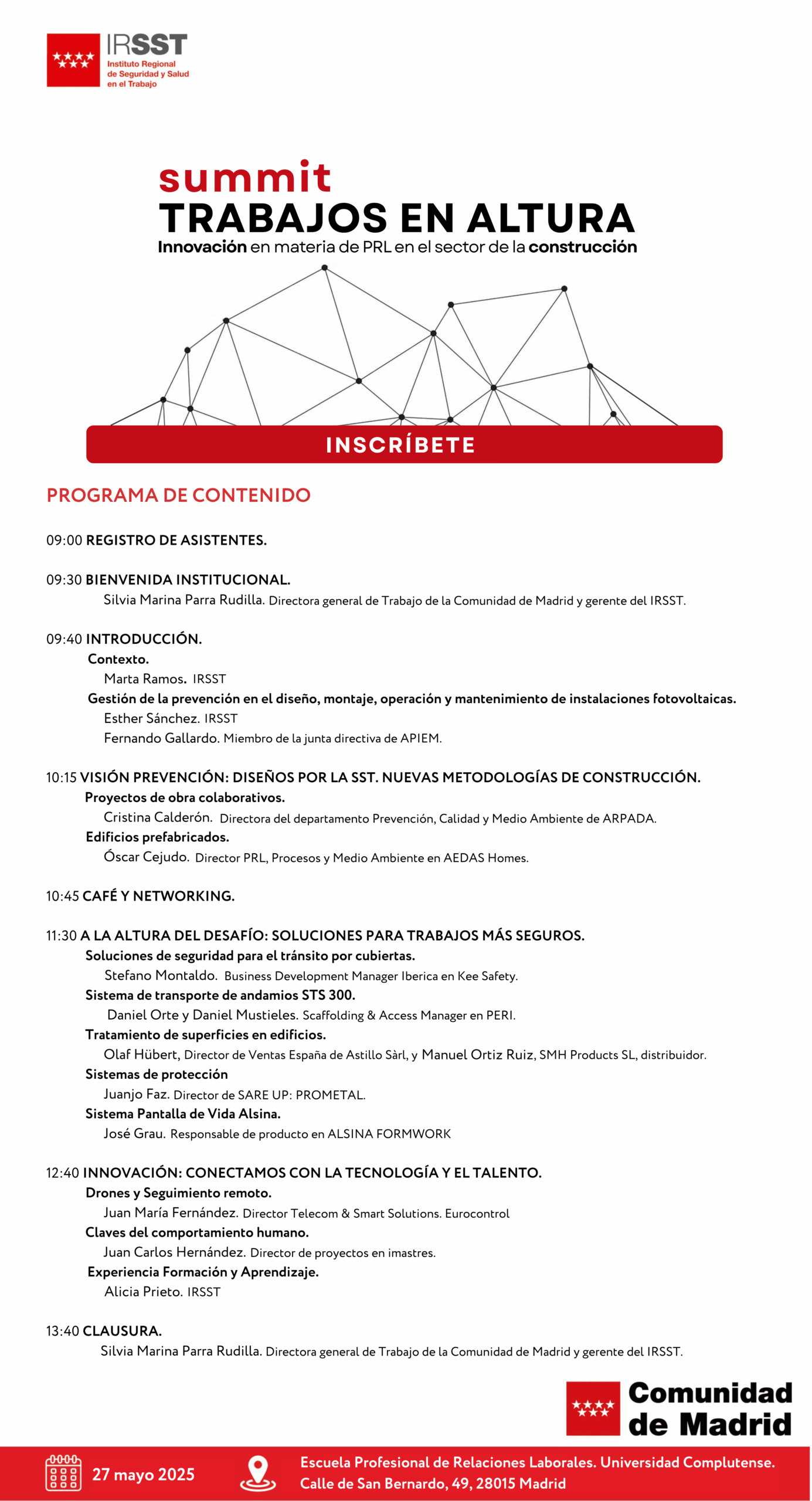 08/05/2025 El próximo 27 de mayo, el IRSST de la Comunidad de Madrid celebrará el evento “Summit Trabajos en Altura” sobre innovación en materia de PRL en el sector de la construcción que tendrá lugar en la Escuela Profesional de Relaciones Laborales- Universidad Complutense de Madrid.