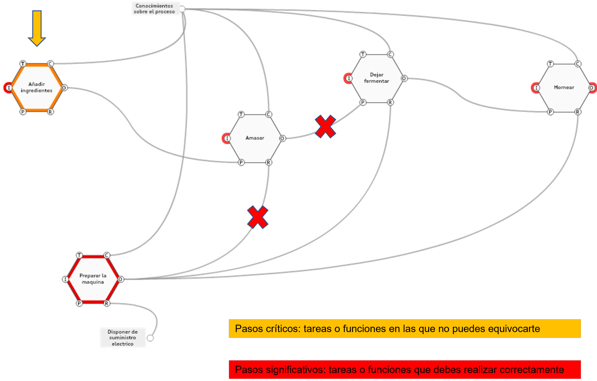 De manera cualitativa, se marca en rojo la función que era crítica en esta instantánea del proceso, y en naranja la función que podría ser significativa (debes seguir un orden correcto para agregar los ingredientes pero si no lo haces el proceso aún continúa con probabilidad de obtener un resultado esperado similar por lo que la variabilidad aún permanece pero en una escala más baja).