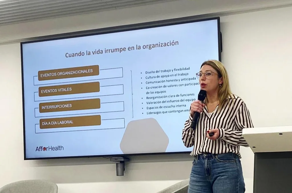 Camille Gil (Affor Health), centró el foco en la experiencia de empleado y en 🎯 cómo realizar seguimientos periódicos, generar documentación compartida entre departamentos, y aplicar estrategias como medidas específicas a grupos localizados.