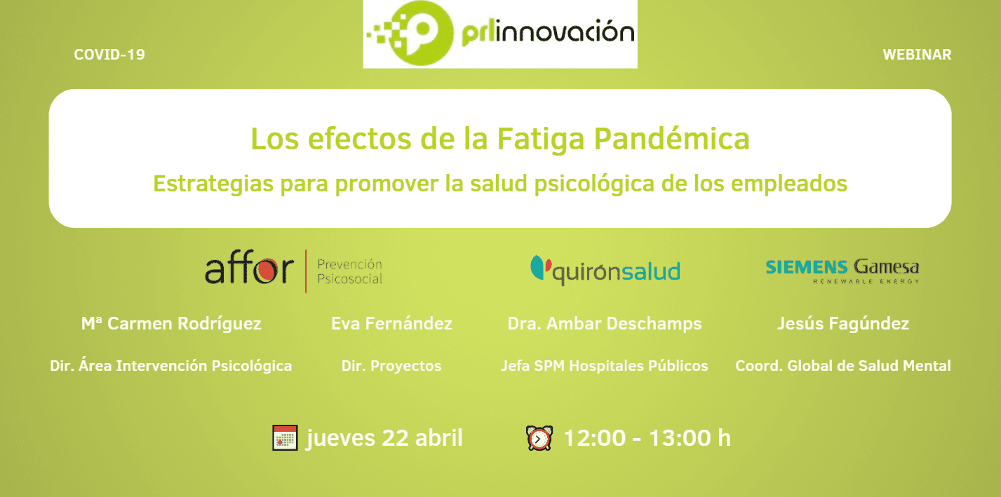 El jueves 22 de abril nuestro partner Affor, experto en gestión psicosical y gran apoyo en las Líneas de trabajo de Bienestar y Salud, moderará una mesa redonda para profundizar de forma detallada en cómo esta fatiga pandémica o cansancio psicológico está afectando a nuestra salud psicológica.